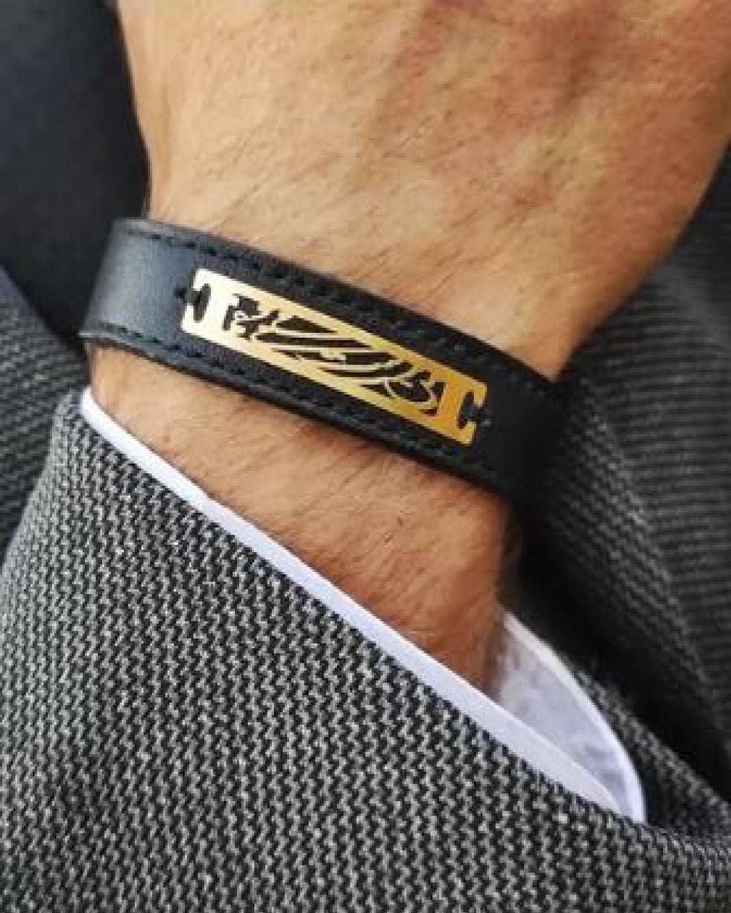 A bold men’s bracelet featuring a sleek black leather band and an elegant 18kt yellow gold plate....
